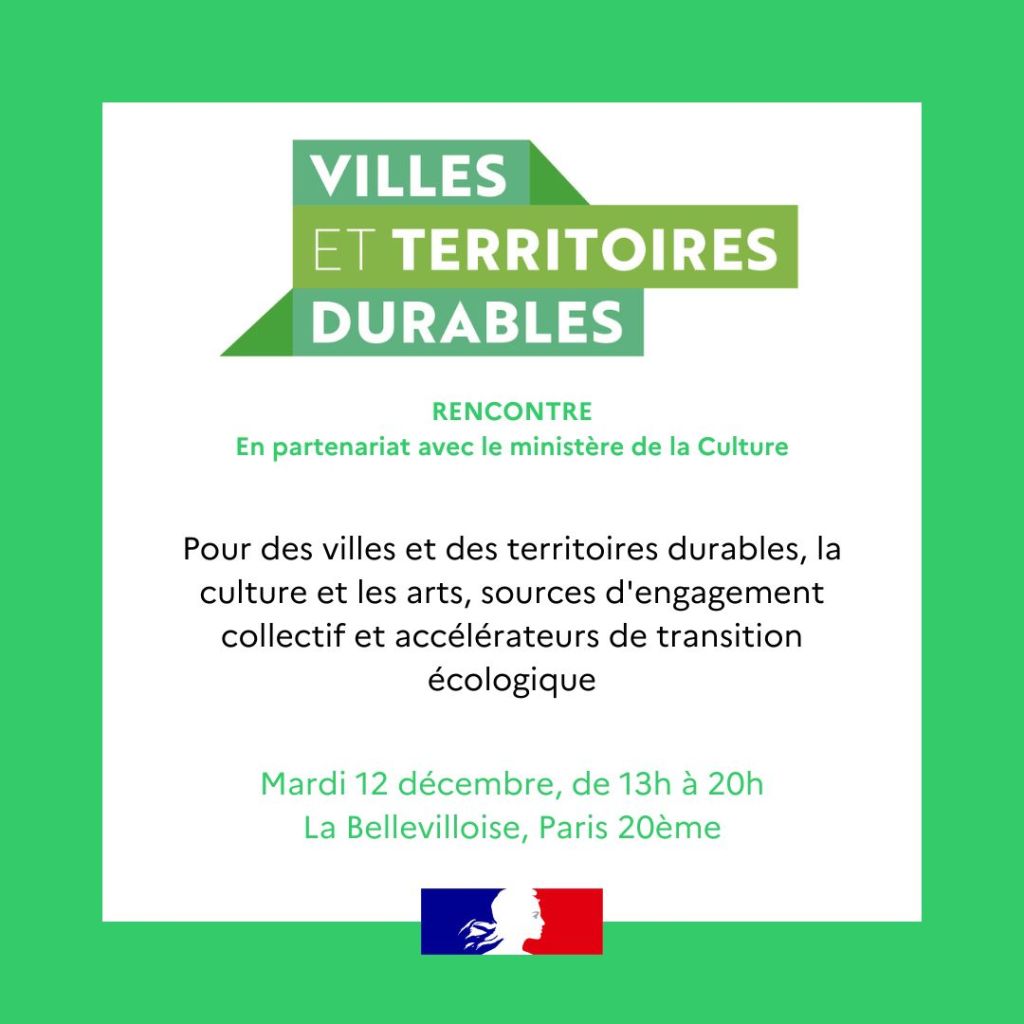 Le ministère de la Transition écologique et de la Cohésion des territoires, en partenariat avec le ministère de la Culture, vous invite à participer à une rencontre pour des villes et des territoires durables, avec la culture et les arts comme sources d’engagement collectif et accélérateurs de transition écologique.