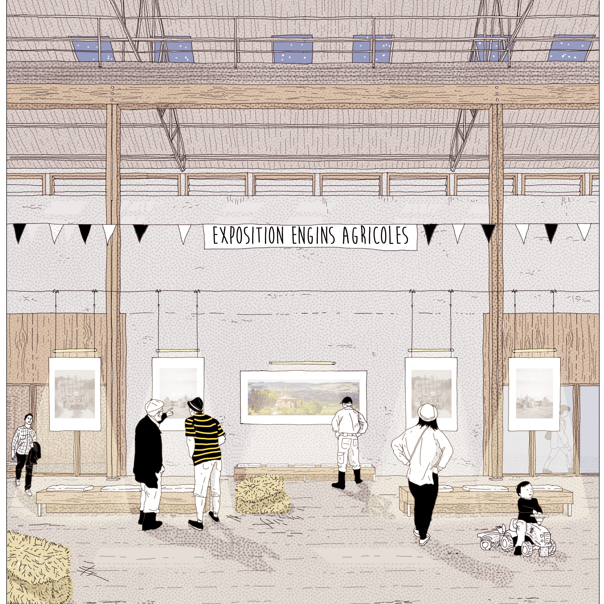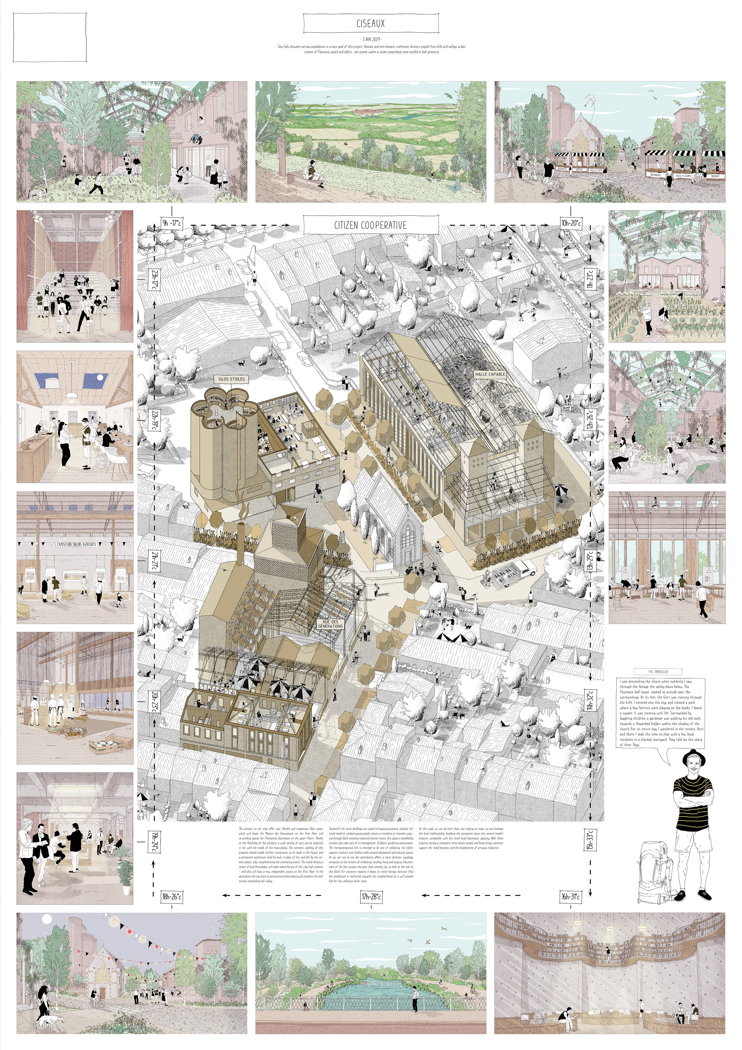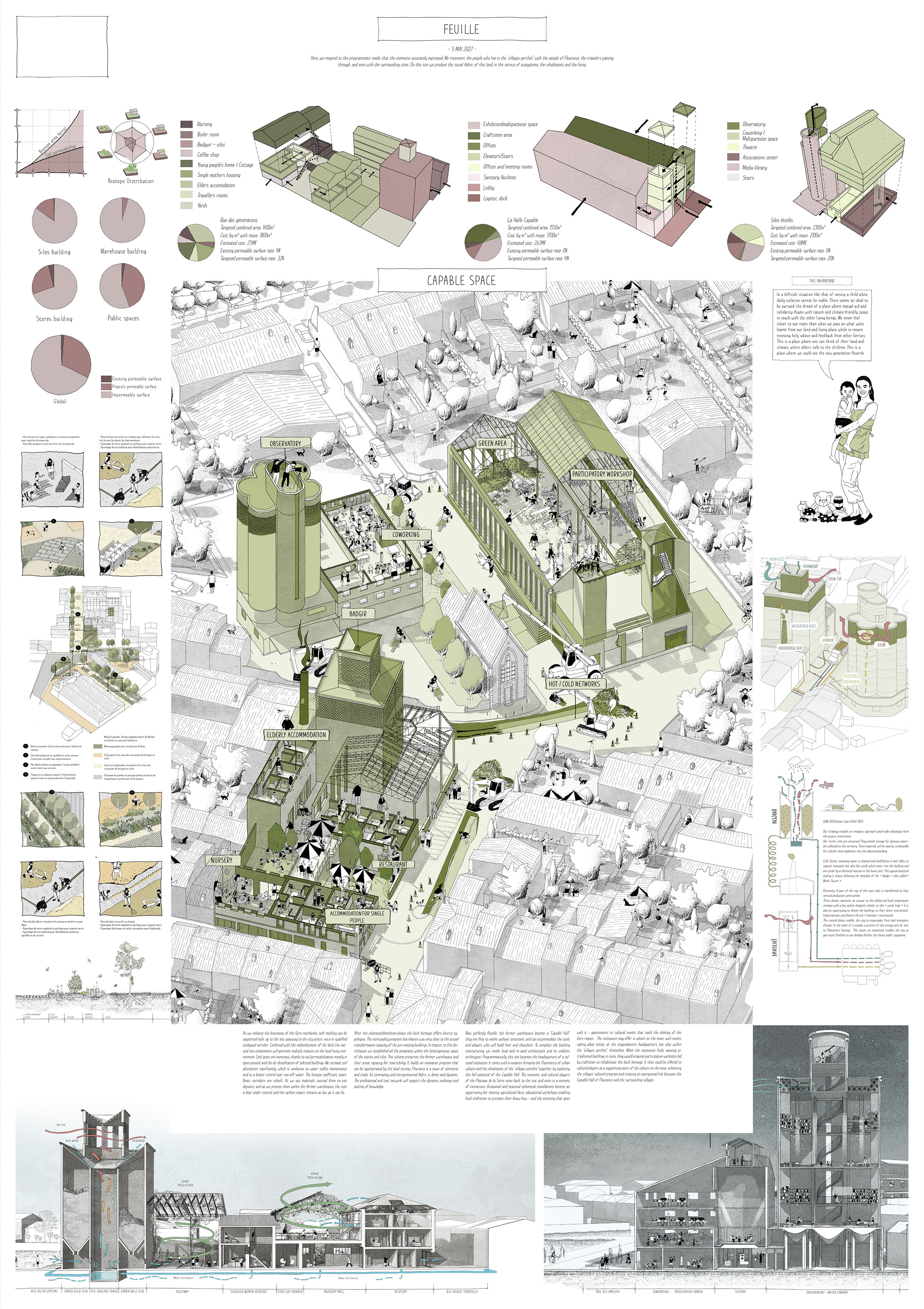 La requalification de l’ancienne coopérative Gersycoop fournit une opportunité pour proposer un arpentage alternatif du territoire qui, par quelques actions frugales, va permettre de requalifier la perception de la commune dans le grand paysage. Des points de vue en belvédère sont aménagés au sein des coteaux boisées afin de permettre une contemplation de la vallée et de Fleurance dans son écrin naturel. En contrebas, le site de projet est à proximité du lieu où la présence de l’eau se fait le plus sentir : nous pouvons considérer cet espace comme l’opportunité de régénérer des porosités entre espace urbain et cours d’eau au service des Fleurantins et de leurs hôtes de passage. La constitution d’un parc en bord de berges du Gers permet à la fois de rendre sa valeur structurante au cours d’eau et de proposer un parcours alternatif d’entrée de ville plus qualitatif que les voies rapides passant à travers les zones industrielles. Cette intervention doit permettre de reconstituer les couloirs biotiques, enjeu identifié dans le Scot Gascon et d’amplifier la biocénose locale afin de mener à travers un corridor vivant jusqu’aux portes de Fleurance, sur notre site.