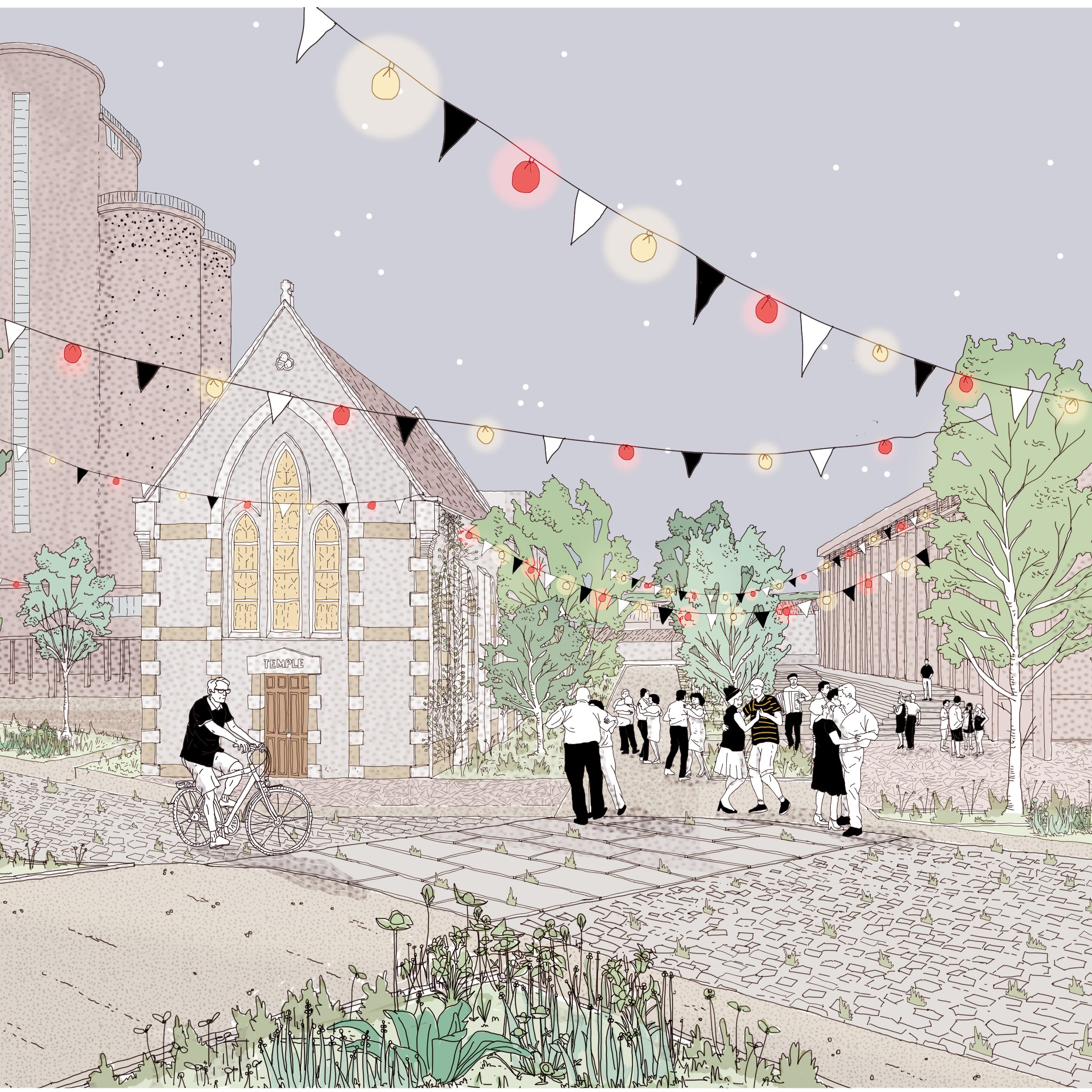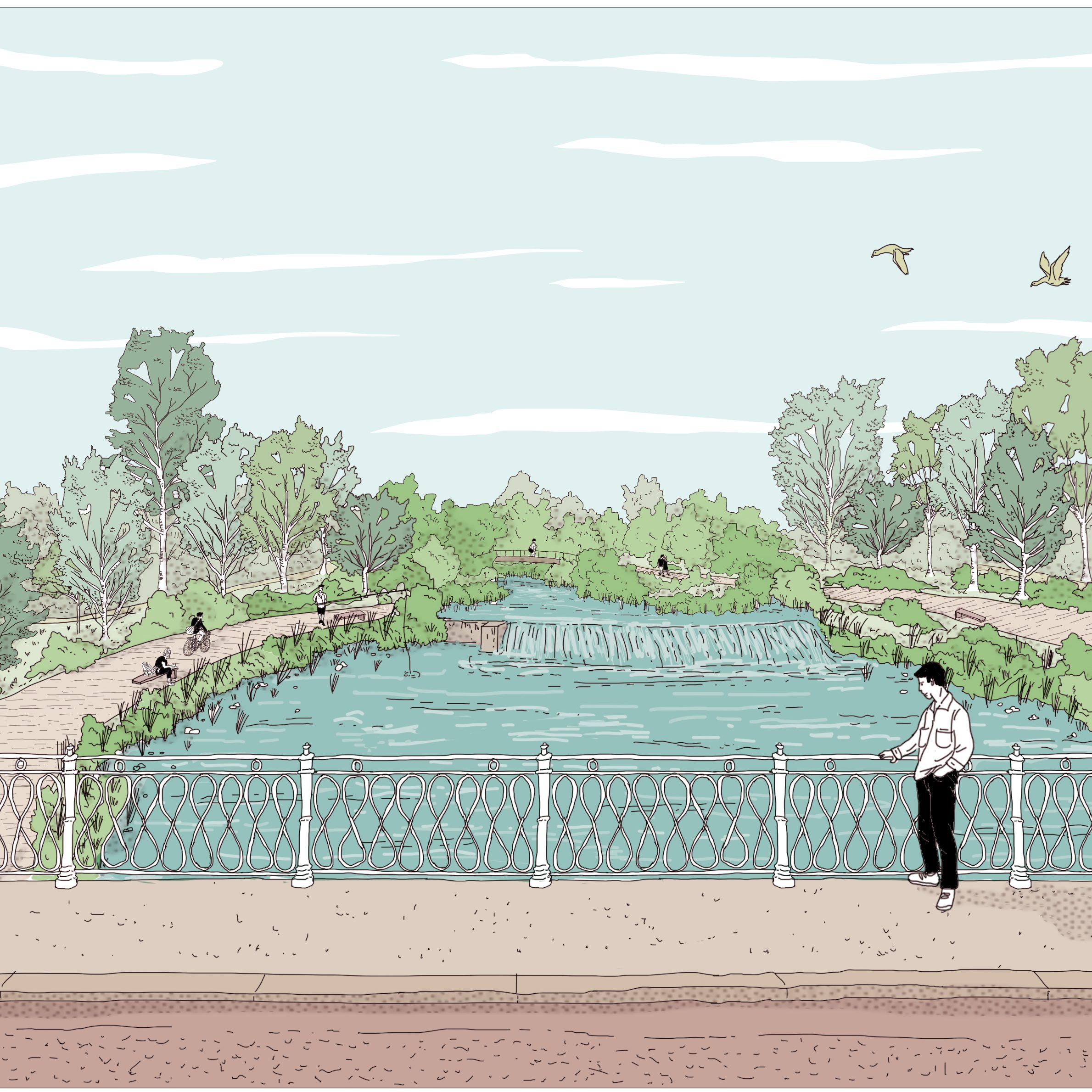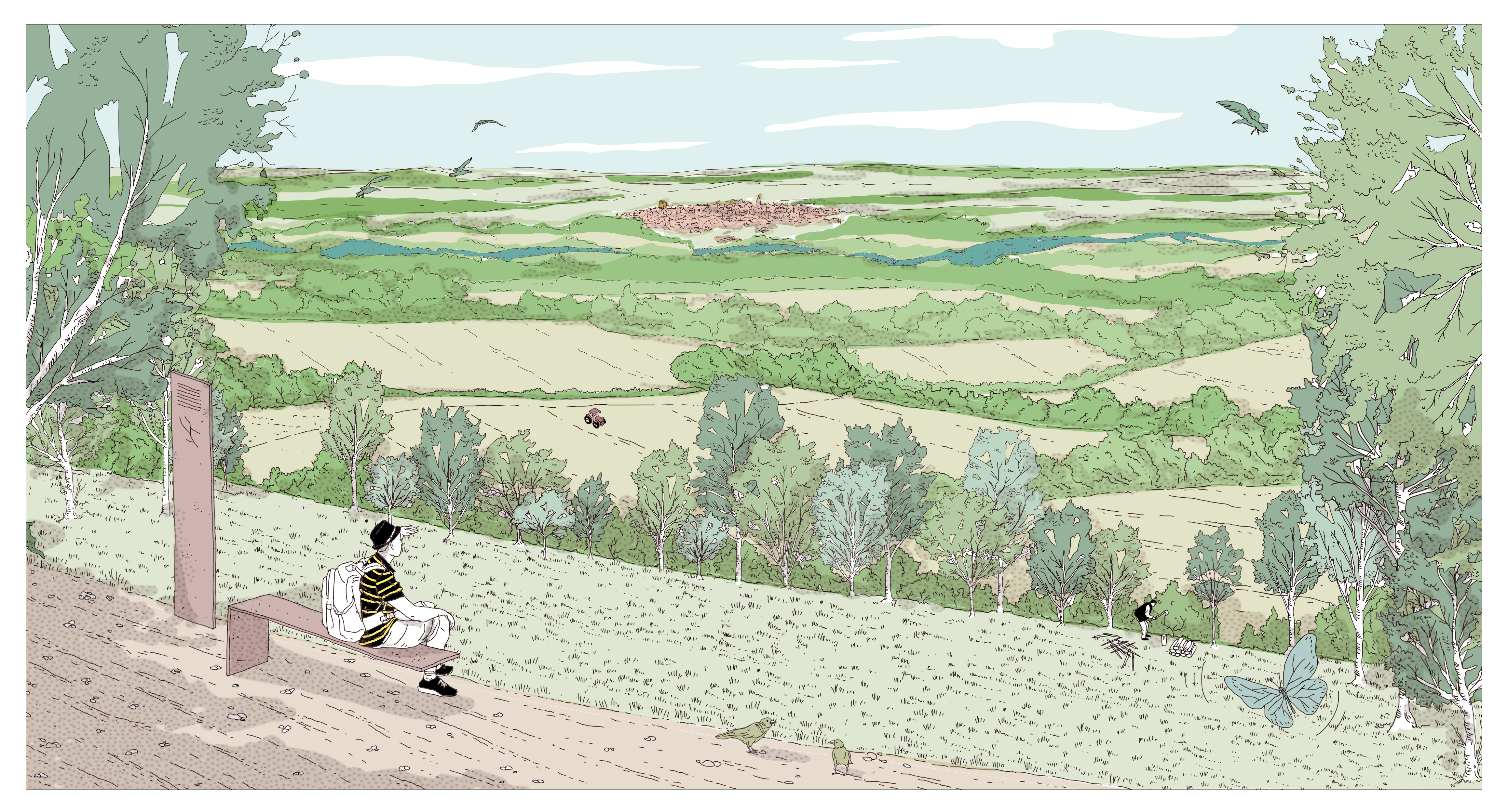 La requalification de l’ancienne coopérative Gersycoop fournit une opportunité pour proposer un arpentage alternatif du territoire qui, par quelques actions frugales, va permettre de requalifier la perception de la commune dans le grand paysage. Des points de vue en belvédère sont aménagés au sein des coteaux boisées afin de permettre une contemplation de la vallée et de Fleurance dans son écrin naturel. En contrebas, le site de projet est à proximité du lieu où la présence de l’eau se fait le plus sentir : nous pouvons considérer cet espace comme l’opportunité de régénérer des porosités entre espace urbain et cours d’eau au service des Fleurantins et de leurs hôtes de passage. La constitution d’un parc en bord de berges du Gers permet à la fois de rendre sa valeur structurante au cours d’eau et de proposer un parcours alternatif d’entrée de ville plus qualitatif que les voies rapides passant à travers les zones industrielles. Cette intervention doit permettre de reconstituer les couloirs biotiques, enjeu identifié dans le Scot Gascon et d’amplifier la biocénose locale afin de mener à travers un corridor vivant jusqu’aux portes de Fleurance, sur notre site.