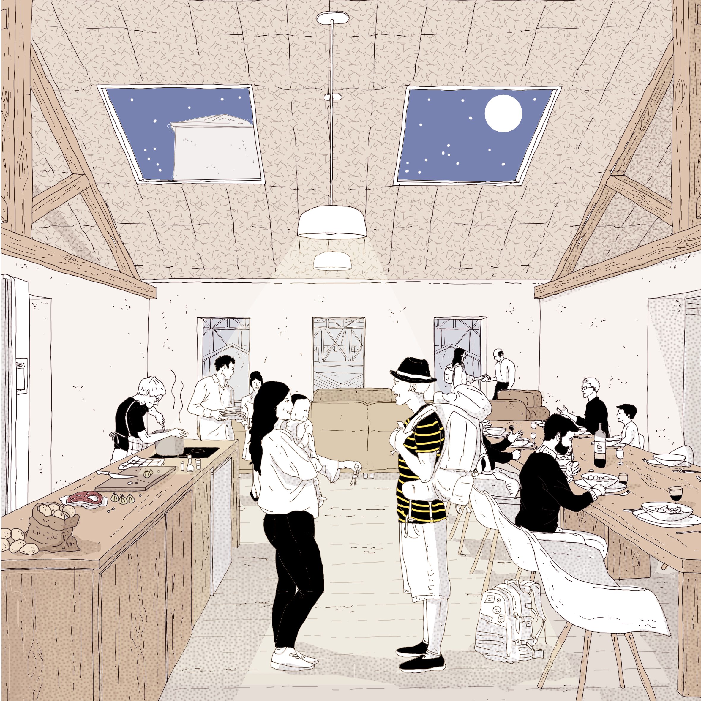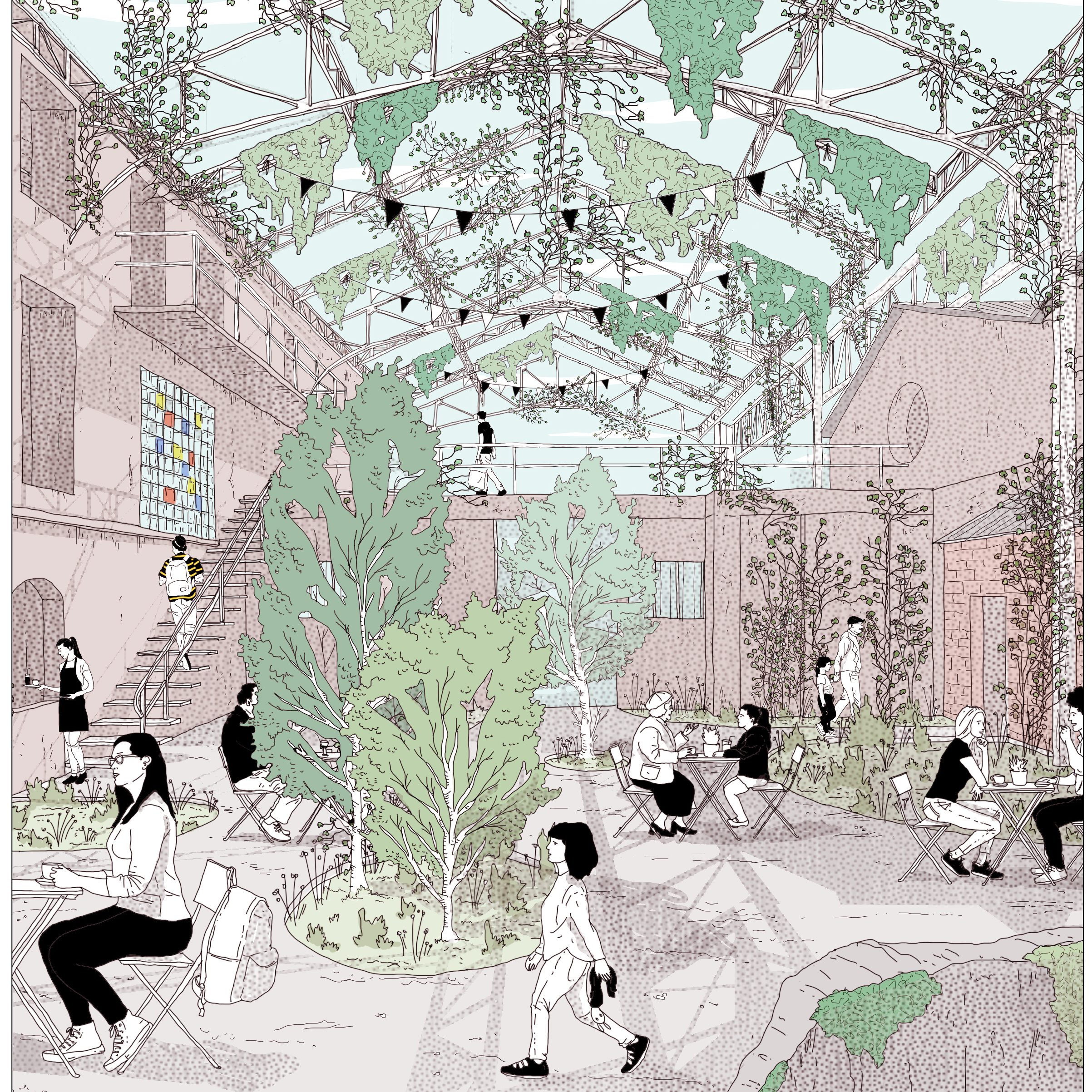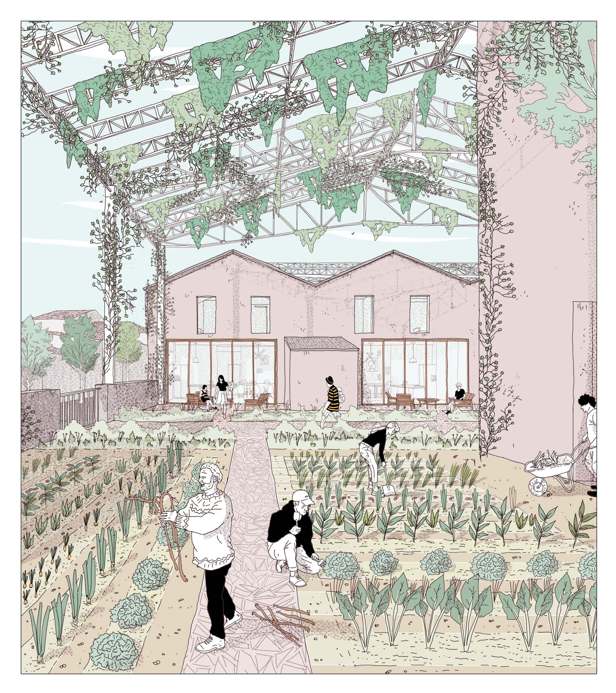 Les magasins correspondent à un enchevêtrement d’habitations envahies par des bâtiments industriels. La première étape consiste à démonter les structures « légères » pour éclaircir le cœur d’ilot et le ramener à l’échelle domestique du quartier. Une fois l’enveloppe des hangars démontés, les matériaux hors amiante sont récupérés pour être réemployés / recyclés. Les excroissances en durs sont également démolies (dalles béton, murs en briques) et les gravats sont concassés pour constituer des remblais ou des revêtements de sol finis types graviers. Les couvertures en tuiles refaites constituent une ressource qui sera convoquée dans la mise en place de dispositif énergétiques en façade et dans les aménagements paysager des espaces publics. Le volume démoli constitue un gisement de matériaux pour les phases à venir. Le réemploi est optimisé afin de réduire au maximum les déchets issus du curage qui ne trouveront pas de seconde destination.