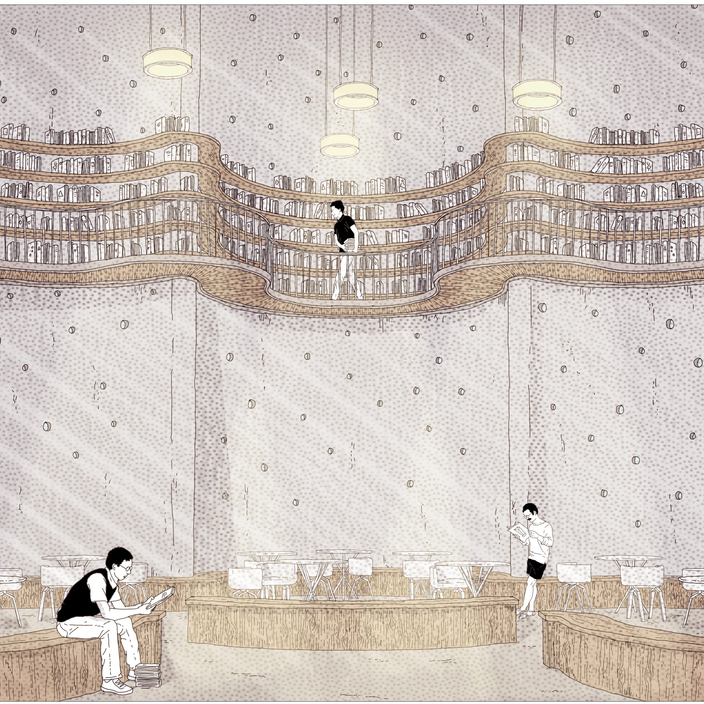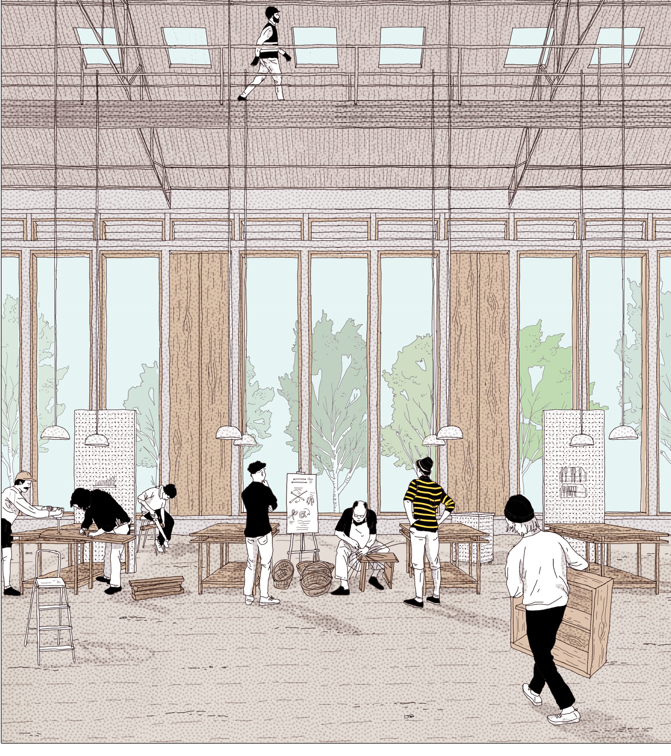 Le bâtiment des silos à grains fait l’objet d’une déconstruction ciblée. Les cloisons des vastes plateaux attenants sont déposées. Les silos secondaires au sein de cette annexe sont également démontés afin de libérer l’espace toute hauteur. Le principe d’intervention sur ce bâtiment est de minimiser l’intervention et de libérer un espace flexible exploitant au maximum le déjà là avec un minimum de retouche. Préservée, l’enveloppe des silos à grains est préparée et partiellement perforée. Certains toits sont également déposés au sommet du silo. Les modes d’accès sont rendus indépendants entre les silos à grains et l’annexe. Le bâtiment latéral côté ouest est entièrement déposé afin de libérer de l’espace public et d’augmenter la végétalisation des sols sur la parcelle. Géré par des artisans issus des plateaux et des experts de la filière du réemploi, l’entrepôt va servir d’espace de préfabrication et de recyclage basé sur un principe participatif de mise en commun des moyens de production. Les silos en plastiques sont démontés et les plaques de toiture en fibrociment, amiantées, sont déposées. Les cuves et élévateurs sont conservées et permettent d’installer les bureaux de réunion de chantier et les espaces administratifs dans les tours. Les sols existants, inclinés, sont retravaillés via des fonds de forme avec sous-couches de graviers élaborés à partir des premières ressources récupérées sur site lors d’opérations de reperméabilisation des sols. La démolition des remplissages intérieurs des voiles entre porteurs libèrent un hangar ouvert sur le reste de l’opération. Il s’agit de la première intervention du phasage afin de libérer progressivement de la place à des espaces vitales pour le chantier. La base vie du chantier croit à mesure que l’espace se libère. Elle est un indicateur de l’intensité du chantier sur l’ensemble de l’opération.