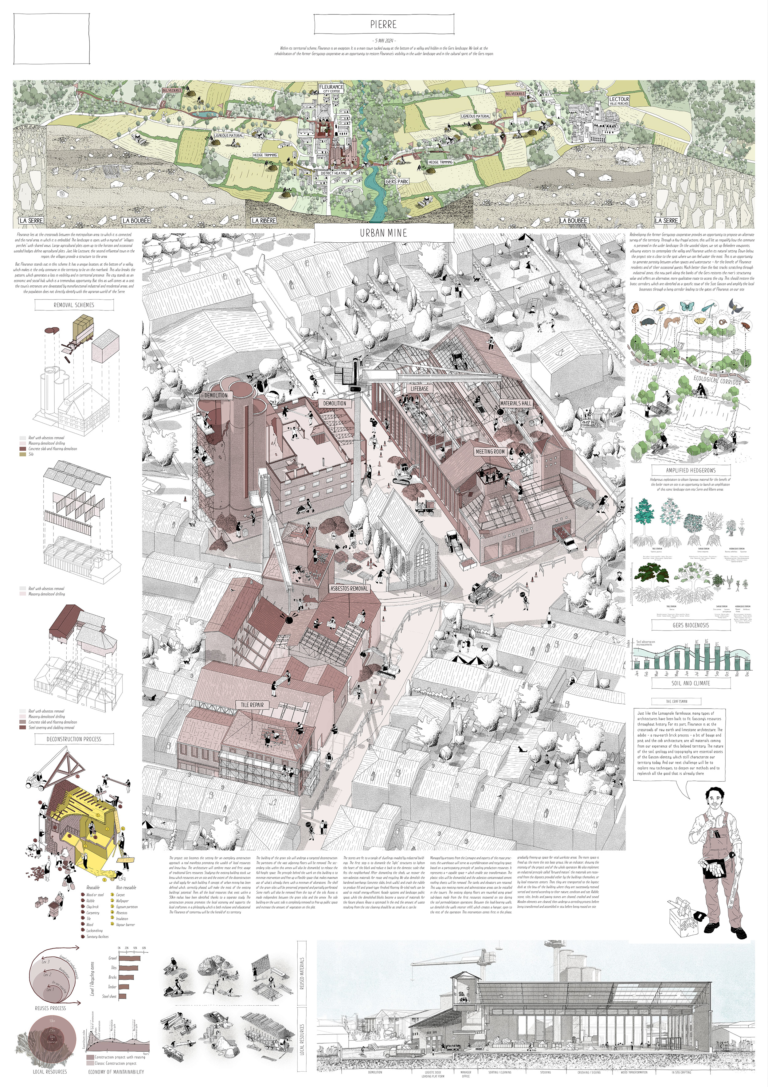 Le site de projet devient le lieu d’une démarche constructive exemplaire, un manifeste promouvant la richesse des ressources et des savoir-faire locaux. L’architecture mêlera réemploi et ressources traditionnelles gersoises. Un audit de l’existant a été effectué afin de définir la nature des ressources sur site et l’ampleur des déconstructions envisagées pour chaque bâtiment. Le concept de mine urbaine a ainsi été déployé et correctement phasé afin d’exploiter au mieux le potentiel d’accueil du bâti existant. Un second audit a été effectué afin de définir les ressources locales exploitables dans un rayon de 50km. Le processus de construction fait la part belle à l’économie locale et au soutien des artisans sur le territoire, dans une démarche inclusive mais également pédagogique : la Fleurance de demain sera le hérault de son territoire.